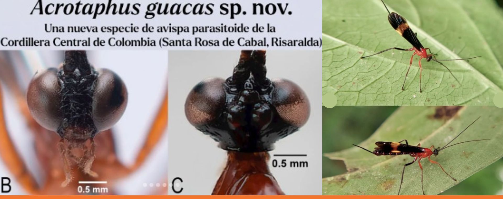 La avispa denominada 𝘈𝘤𝘳𝘰𝘵𝘢𝘱𝘩𝘶𝘴 𝘨𝘶𝘢𝘤𝘢𝘴, sp. Nov, hace parte de las especies de 𝘈𝘤𝘳𝘰𝘵𝘢𝘱𝘩𝘶𝘴 Townes, 1960 (Hymenoptera: Ichneumonidae: Pimplinae) que están presentes en el país y su nombre hace referencia a la vereda Guacas, territorio de Santa Rosa de Cabal – Risaralda, en donde se realizaron las investigaciones.