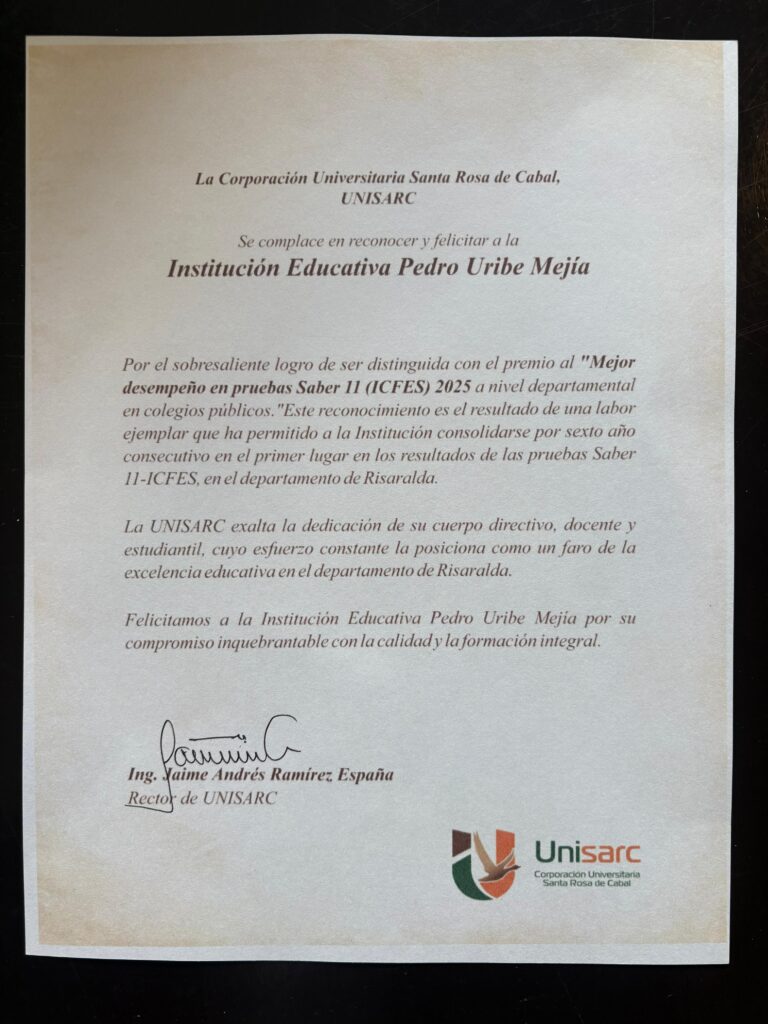 “La UNISARC se complace en reconocer y felicitar a la Institución Educativa Pedro Uribe Mejía por este sobresaliente logro. Este reconocimiento es el resultado de una labor ejemplar. Exaltamos la dedicación de su cuerpo directivo, docente y estudiantil, cuyo esfuerzo constante la posiciona como un faro de la excelencia educativa en el departamento de Risaralda.”